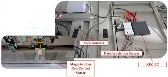 Aiming to minimize the number of components in the DAQ system used in this work, a single triaxial piezoelectric acceleration sensor was used for measuring the elevator’s vibration response and sampling the required SHM data. The sensor was coupled with an A/D card for signal conversion, while a NUC PC was used for data storage as well as coordination of the sampling process. Last, a magnetic proximity sensor was placed on the cabin doors in order to keep track of the cabin’s current state (open/closed). The abovementioned DAQ system is shown in Figure 4.