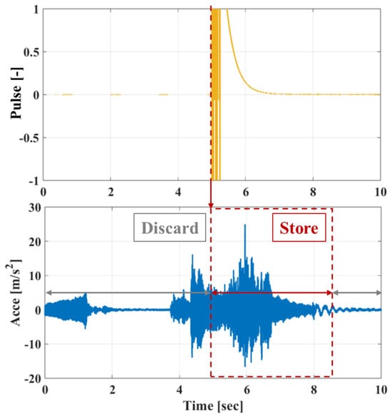 In this work, SHM is achieved by measuring and analyzing vibration data, namely accelerations, measured at the center of the roof of the elevator cabin. Vibration-based damage detection is perhaps the most common damage detection method, with ample applications for various types of structures and machinery [24,25,26,27,28,29], as measurements can be extracted even during the operation of a system, by placing sensors on locations available on its structure. Fault-related features that are present in a system’s acceleration response have also proven useful in damage detection and classification in similar systems in the author’s previous works [17].