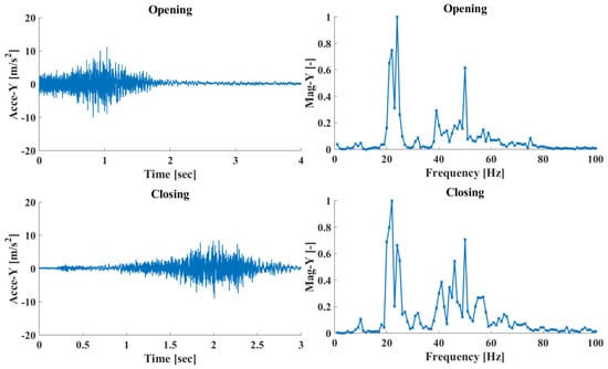 In this work, SHM is focused on the elevator system’s door mechanisms, both for the cabin and the floor doors. As such, measurements of the system’s acceleration response were taken during the door’s opening/closing phases, where the door sliders move along their tracks. For this purpose, the magnetic proximity sensor was used as a trigger for initiating the measuring sequence, where data were stored for a short time window following the sensor’s trigger (door opening) or prior to it (door closing), as shown in Figure 5. The measured system response while opening and closing the cabin doors is shown in Figure 6, for the Y axis of the acceleration sensor, in the time and frequency domains. The data were sampled with a fixed rate of 2048 Hz, yielding a very fine resolution for the phenomena in the frequencies of interest, which are below 100 Hz. It should be noted that while Figure 6 shows both time and frequency domain data, the task of SHM was performed using only frequency domain data, for axes X and Y (horizontal plane) while opening and closing the elevator doors, resulting in data samples of size 4 × 100.