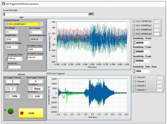 For the task of DAQ as well as for being able to visualize the system’s vibration response from the measuring equipment in real time, dedicated software and GUI were developed using the LabVIEW Software (2021). The software was installed in the NUC PC and was initialized once in order to start the DAQ process. The GUI during the operation of the DAQ system is shown in Figure 7 and, as shown, the user has direct access to all three acceleration channels corresponding to the X, Y, and Z axes as well as the pulse signal from the proximity sensor.