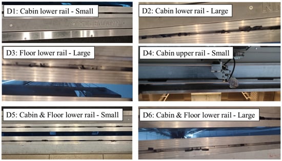 As previously stated, the SHM framework developed in this work aims for the detection and classification of damages in the elevator’s door subsystem. The door subsystem was selected as the candidate for damage for two main reasons: (a) damages in the elevator doors do not compromise the rest of the system which runs the risk of destroying the elevator and (b) damages to the elevator doors are usually subtle and thus hard to detect, providing a challenge for the DL-based SHM algorithms. Damages were artificially induced to the cabin door rails as well as the 12th-floor door rails and in different severity magnitudes, leading to a total of six (6) damage cases, as stated in Table 1.