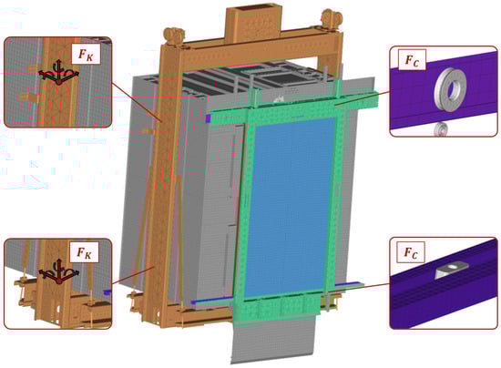 Considering that damaged state data are not usually available prior to the initial appearance of a defect in a mechanical system, for the DL-based SHM framework to be functional from the initial deployment of an elevator, training data are generated through MBD models of the physical system. The MBD model of the system in its healthy state is shown in Figure 9. The model consists of a total of 37 bodies, including the ground, cabin, rails, doors, frames, chassis, wheels, and sliders. The cabin and doors are modeled as flexible bodies as their deformations greatly affect the modal response of the system. The elevator cabin is connected to the chassis through a stiffness and damper force component, acting in all directions, similar to a bolted joint. Lastly, a contact force component is defined between the wheels, bearings and sliders, and the door rails. This contact mechanism is a key component of the MBD model, as its accurate modeling directly affects the signal produced during the operation of the sliding doors in their healthy and damaged states.