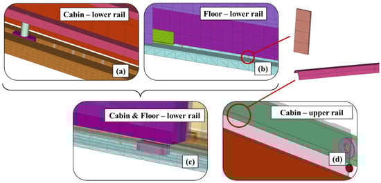 Elevator system MBD model—damaged states: (a) Cabin lower rail, (b) Floor lower rail, (c) Cabin and Floor lower rail, and (d) Cabin upper rail.