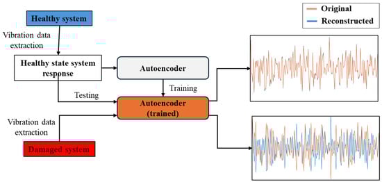 In this work, autoencoders are employed for damage detection in the following manner: when trained on data from a specific health state, an autoencoder will only be able to accurately encode and decode datasets that share characteristics with its training data. Furthermore, the more a data sample deviates from those used in the autoencoder’s training, the greater the error between the true and reconstructed signals. This property of autoencoders deems them capable of damage detection, as an autoencoder trained on healthy state data will not be able to accurately reconstruct a system’s response if the presence of damage in its structure has altered its response, thus leading to an increased reconstruction error. This autoencoder-based damage detection framework is described in Figure 11.