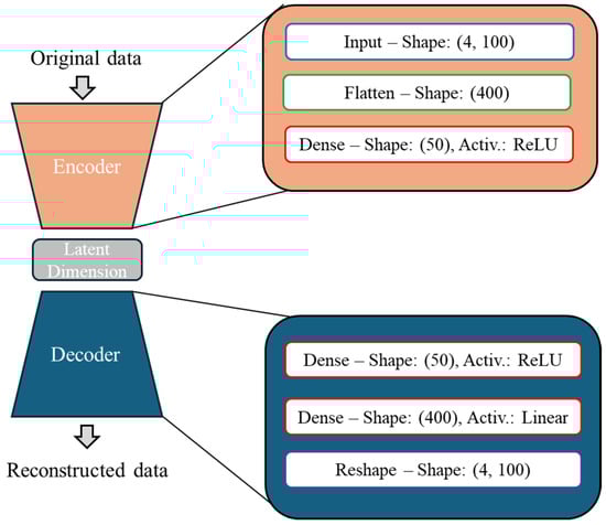 Autoencoders are DL algorithms that are primarily used on data for feature extraction, dimensionality reduction, or compression [30,31] and they are comprised of two ANNs, namely, an encoder and a decoder. The encoder is used to reduce the size of the input data by extracting the most valuable information and compressing it in the latent space while the decoder is a network used to reconstruct the original data from the latent space features. When training an autoencoder model, its parameters are updated by aiming to minimize a loss function, such as the Mean Squared Error (MSE), Root Mean Squared Error (RMSE), Mean Absolute Error (MAE), etc., between the original and reconstructed signal.