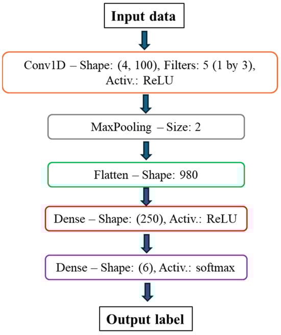 where, denotes the input to the classification layer containing a number of neurons , equal to the number of desired classes. The architecture of the CNN used in this work can be seen in Figure 13. The pooling layer contained in the network is used to reduce the features in the data, only maintaining the most dominant ones, while aiding in avoiding the potential overfitting of the model to the training data. The network is trained using the Adam optimizer, aiming to minimize the categorical cross-entropy loss function, which is formulated as: