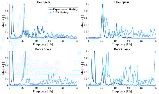 The faulty state models of the elevator system are constructed based on the healthy state one and as such, their responses in the frequency domain are expected to display similar traits as to the healthy system’s simulated response. The main differences that are expected in the responses are those related to features appearing due to the presence of the fault mechanisms in the system. It should be noted that for the CNN classifiers to be able to generalize their predictions on physical measurements, the damaged state simulated responses should display characteristics similar to those contained in the physical system’s response. The experimental and MBD model system responses for all damaged states are shown in Figure 15. The results are only shown for the Y axis and during the door opening process for the sake of brevity, as similar results can be observed for the X axis and during the closing of the doors. As shown in the figure, while the damaged state model responses do contain certain features that are also present in the physical system response, they do not provide a perfect match. Still, should the damage-related features be contained in the data, the CNN classifiers will still be able to achieve an acceptable level of accuracy when making health state predictions.