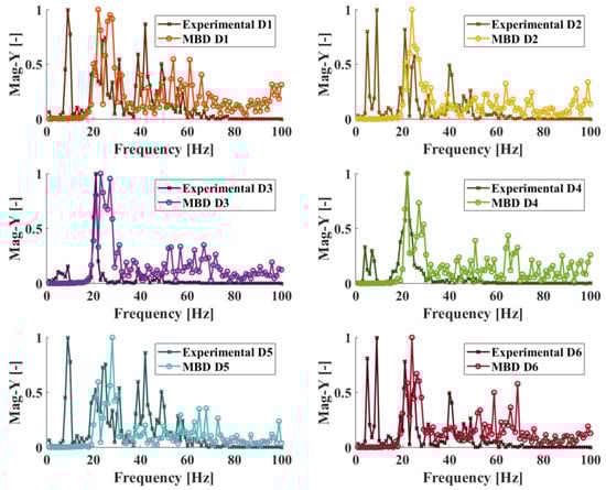 Comparison between the experimental and MBD model frequency response data for damage cases 1–6 at Y axis, doors opening.