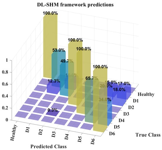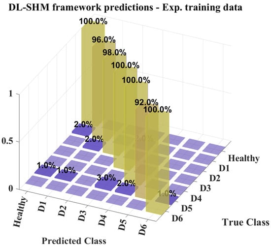 The CNN ensemble constructed consists of a total of ten (10) CNNs, trained on 85% of the simulated damaged state datasets while the other 15% was used for validation. The commonly used 70% to 30% analogy in the training and validation data was not maintained here, as the trained ensemble should ultimately be validated on the experimental data. The 15% validation set was used here mainly to ensure that the trained ensemble is not biased toward any of the classes in the training data. The prediction results of the DL-SHM framework’s implementation on the elevator system are shown in the confusion matrix of Figure 16.