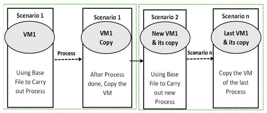 In addition, the flowchart was utilised to direct the execution of planned experiment situations to accomplish the intended outcome within a set time. To prevent wasting time, this approach also offered an overview of how the experiment was carried out. Each procedure made use of fresh VMs that were cloned, removed, and reinstalled after testing to guarantee that each scenario was produced in a new VM environment and that accurate data were collected. In the newly generated VMs, the following situations were tested. Figure 2 depicts the use of virtual machines (VMs) during the scenarios.