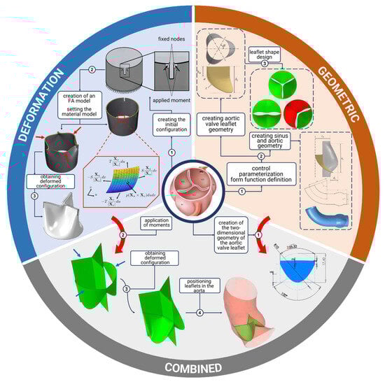 In modeling hemodynamics and examining the mechanical behavior of the aortic valve, it is essential to create geometric models based on physiological data and the accumulated statistical information on the shapes and sizes of the aorta and its leaflets. As illustrated in Figure 1, two primary approaches can be employed to construct such models: geometry-parameterized models and deformation-based models. In geometry-parameterized models (Figure 1, top-right), several controlling parameters and functions are used to define the leaflet’s curvature [24,25,26]. A similar process is used to define the geometry of the aortic root. By adjusting these parameters, researchers can generate a wide range of geometric models with various shapes and sizes. A critical aspect of this approach is determining the appropriate range of parameter variations and developing a comprehensive set of functions. The second approach (Figure 1, top-left) focuses on constructing geometric models by deforming an initially idealized leaflet configuration from a fully open state to a closed position [27,28]. Typically, a cylindrical blank is created and divided into three sections that are fixed at certain nodes. A load is then applied to each of these sections until they come into contact, and the resulting configuration serves as the baseline model of the aortic valve leaflets. Although this method involves fewer parameters, it is strongly dependent on the choice of the material model used to describe the mechanical properties of the valve leaflets. Combined approaches (Figure 1, bottom) that involve specifying the geometric dimensions of a two-dimensional leaflet and determining its curvature through deformation to make contact with the remaining leaflets are also employed [29].