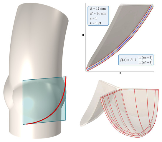The algorithm for constructing an idealized geometric model involves several critical steps. First, the aortic root is segmented into three equal sectors, each representing one of the valve leaflets. A plane perpendicular to the radius of one of the sectors is constructed to define the generating curve. A generating curve is defined in this plane (Figure 2), for which the values of the following parameters are set: R is the aortic radius, H is the height of the leaflet, a modifies the curvature of the leaflet, and k is responsible for the shape of the free edge.