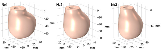 Left ventricular heights varied from 73 mm to 89 mm. As the height varied, the volume of fluid inside the ventricle also varied. The geometries are presented in Figure 3. The fluid volume varied within the physiologically normal volumes of the human left ventricle.
