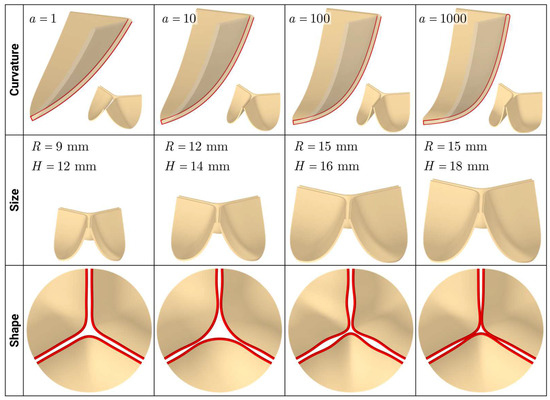 Figure 4 shows variations in aortic valve leaflet geometries depending on curvature, size, and shape. It can be seen that variations in different parameters can generate models of either older or younger patients’ valves. By applying this comprehensive approach, we aim to establish an extensive synthetic database of aortic valve geometries. This database will significantly enhance the capabilities of predictive modeling for surgical outcomes, utilizing advanced machine-learning techniques to provide more accurate and reliable predictions, ultimately improving patient care and treatment outcomes.