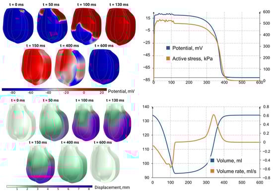 Figure 6 and Figure 7 show the results of the left ventricle contraction simulations. Systole–diastole closed loops are used to plot the changes in ventricular volumetric strain and von Mises stress during the heart cycle. The dependence of the active potential corresponds to the data presented recently in [40]. It is believed that strain–volume dependence can be used as a noninvasive evaluation tool for dynamic heart function by combining systolic and diastolic biomechanical features. The simulated volumetric strain loops data are similar to the findings presented in [41]. In addition, it should be pointed out that the simulated von Mises stress results correspond to data presented by Dorri et al. [42], who noted that values vary around 100 kPa within a range of about 50 kPa.