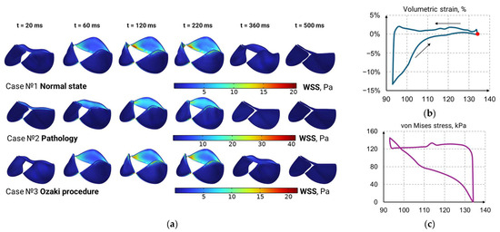 (a) Wall shear stress distribution in aortic valve leaflets, and (b,c) volumetric strain and von Mises stress loops for ventricle contraction.