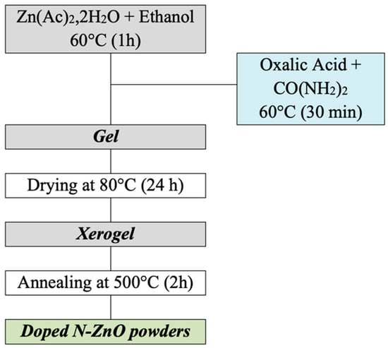ZnO was synthesized through a sol–gel method, using zinc acetate dihydrate (Zn[CH3COO]2·2H2O; Lobachemie) as the metal precursor, ethanol (C2H6O; AnalaR NORMAPUR) as the solvent, and oxalic acid dihydrate (C2H2O4·2H2O; SIGMA-ALDRICH) as the complexing agent. To create nitrogen-doped ZnO (N-ZnO) samples, urea (CO(NH2)2) was employed as the nitrogen precursor, with molar ratios of 0%, 3%, 5%, and 7% (Figure 1). The synthesized ZnO and N-ZnO samples were labeled as ZnO and xN-ZnO, respectively, where “x” denotes the nominal nitrogen content.