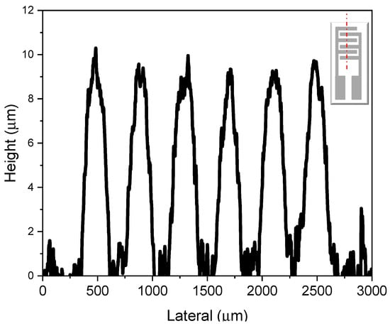 For this study, a blank substrate was used, i.e., the alumina substrate before the deposition of the sensing material, with both the heater and interdigitated electrodes exposed. Using the DektakXT profilometer, five distinct paths were scanned across the interdigitated electrodes on the front side of the substrate, and an additional five paths were analyzed across the heater located on the backside. Figure 2 shows a plot of the results obtained from the DektakXT profilometer across one of the selected paths on the interdigitated structure (red dots), shown in the inset in Figure 2.