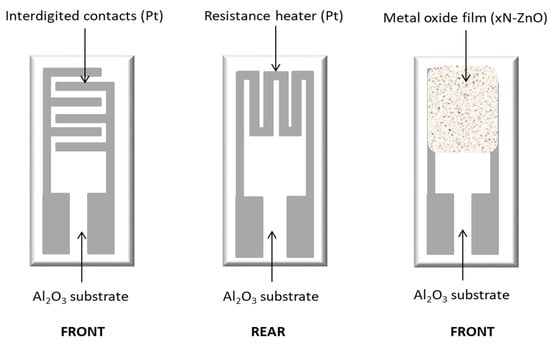 For gas-sensing applications, conductometric sensors were fabricated by screen-printing thick ZnO films onto alumina substrates (6 mm × 3 mm) fitted with platinum interdigitated electrodes and a platinum heater on the reverse side (Figure 3) [26].