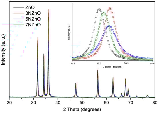 The structural characteristics of the synthesized samples were further analyzed using XRD (Figure 4). All samples exhibited the hexagonal wurtzite structure characteristic of zinc oxide (JCPDS No. 36-1451), as confirmed by the diffraction peaks corresponding to the (100), (002), (101), (102), (110), (103), and (112) planes of ZnO. These findings suggest that the introduction of nitrogen does not alter the crystal structure of ZnO. A magnified view of the diffraction patterns reveals a noticeable red shift in the (101) peak position in the doped samples, indicating successful nitrogen incorporation into the ZnO lattice [27]. We can note that both the shift and intensity reduction in the diffraction peaks do not follow a clear trend with the N-doping. This suggests that the introduction of N into the ZnO lattice is not straightforward, depending in a complex manner on the N:ZnO ratio and leading to samples with different structural parameters and different distortion degrees.