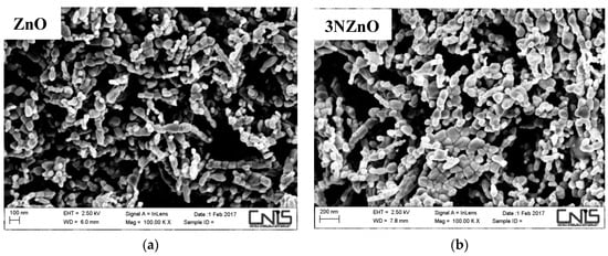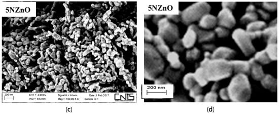 SEM images in Figure 5 display the morphology of the nitrogen-doped sample (xN-ZnO). The particles exhibit an irregular shape, typical of nanoparticles. A closer look reveals that the overall morphology remains consistent across the samples, indicating that nitrogen doping does not significantly affect the morphological features of the original ZnO NPs. Compared to XRD, the SEM technique (see Figure 5d) shows a larger particle size instead, indicating that they are constituted by these smaller primary crystallites.