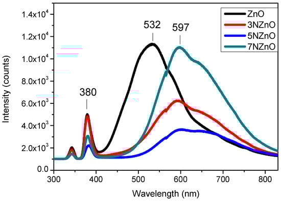 The pure ZnO nanoparticles exhibit two main emission peaks: a near-band-edge (NBE) emission in the UV region (around 380 nm) attributed to the recombination of electrons and holes at the band edges and a broader, stronger green emission peak around 532 nm [28]. The visible emission is commonly associated with oxygen vacancies on the ZnO surface. On N-doped ZnO samples, the large green band shift is around 532 nm vs. higher wavelengths (597 nm). This shift of visible emission band on N-doping may be due to changes in the local environments of the defect centers in the samples [29]. Furthermore, we also noted a change in the intensity of the blue and green peaks, confirming the modifications of the structural parameters with the N-doping.