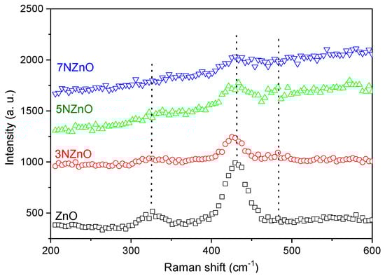 Raman spectra, shown in Figure 7, provide further insight. In the undoped ZnO sample, characteristic peaks were observed at 333 cm−1 and 438 cm−1, corresponding to the E2 (high) vibrational modes [30]. The prominent peak at 438 cm−1 is a hallmark of the Raman-active E2 (high) mode of wurtzite ZnO [31], while the peak at 333 cm−1 corresponds to a second-order vibrational mode, specifically E2 (high)–E2 (low).