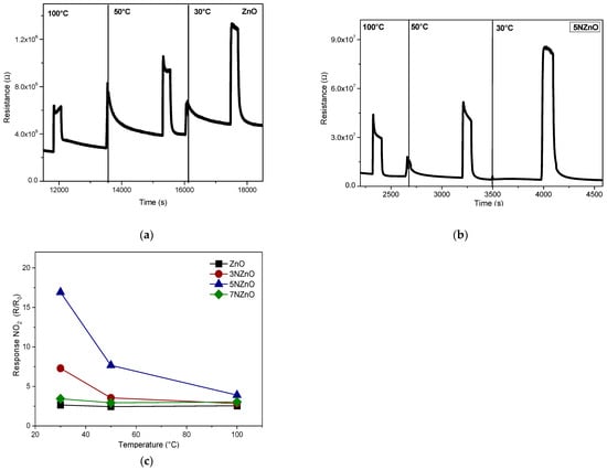 Tests of the ZnO (a) and 5N-ZnO (b) sensors vs. 5 ppm of NO2 under UV irradiation at different low temperatures from 30 to 100 °C. Response vs. temperature of the developed samples when exposed to 5 ppm of NO2 (c).