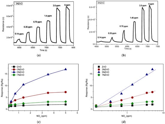 Tests of the ZnO (a) and N-ZnO (b) sensors vs. different concentration values of ppm of NO2 under UV irradiation at temperature value of 30 °C. Response vs. NO2 concentration values of the developed sensors under UV irradiation at temperature value of 30 °C (c,d).