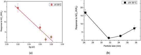 Plot reporting the trend of sensor responses to NO2 (5 ppm) at temperatures of 30 °C under UV light irradiation vs. (a) the optical band gap and (b) grain size.