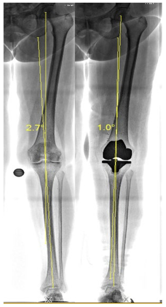 The knee alignment for each participant will be determined pre- and postoperatively through long leg X-ray imaging. As seen in Figure 2, the mechanical axis will be measured in order to determine the degree of angulation of a participants’ knee [46].