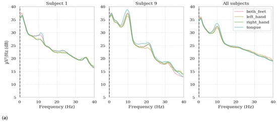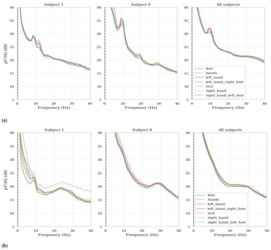 The average PSDs belonging to dataset 1 for Subject 1, Subject 9, and all subjects; (a) 22 EEG channels; (b) 3 EOG channels.