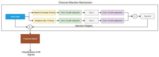 The pooled outputs are then passed through two 1D convolutional layers, where the first layer reduces the number of channels, and the second restores them to their original count. This approach allows the model to focus on the most important features by compressing and then restoring the channel information, enhancing the effectiveness of the attention mechanism. A ReLU activation function is applied between these layers to introduce non-linearity. The outputs from the average and max pooling paths are combined and passed through a Sigmoid activation function, which scales the output values to a range between 0 and 1. This scaling acts as a gating mechanism, determining the importance of each channel. The scaled values (attention weights) are then multiplied with the original input data, effectively amplifying the most informative channels and attenuating the less relevant ones. These refined data are then fed into the proposed deep learning model, allowing it to focus on the most significant channels and improving its ability to classify motor imagery tasks by filtering out noise and irrelevant information. This channel attention mechanism is incorporated into the model architecture and is placed between the input and the proposed deep learning model (described in Section 2.1), as shown in Figure 4.