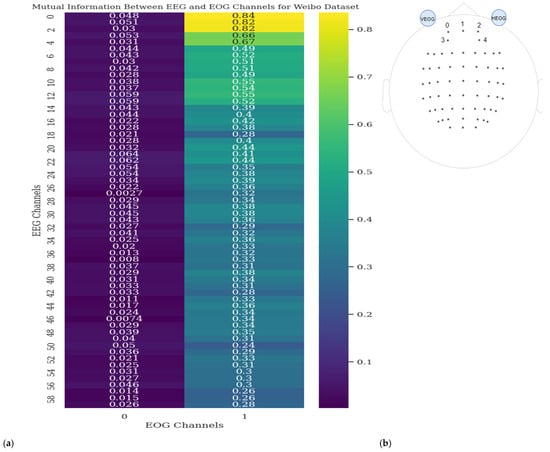 Similarly, EOG 2 has the highest mutual information with EEG12, EEG5, and EEG11, respectively. It is observed that the highest mutual information between EOG and EEG channels typically occurs between channels located on the same side of the brain. In Figure 6, the Vertical Electrooculogram (VEOG) channel (index 0) exhibits low mutual information with all EEG channels, whereas the Horizontal Electrooculogram (HEOG) channel (index 1) shows high mutual information, particularly with frontal EEG channels. This suggests that these channels are likely capturing similar information, and the closer the EEG and EOG channels are to each other, the higher the mutual information score (except VEOG in dataset 2).