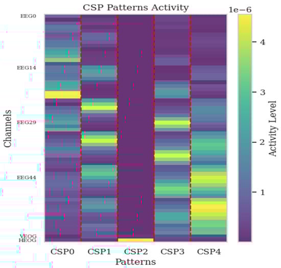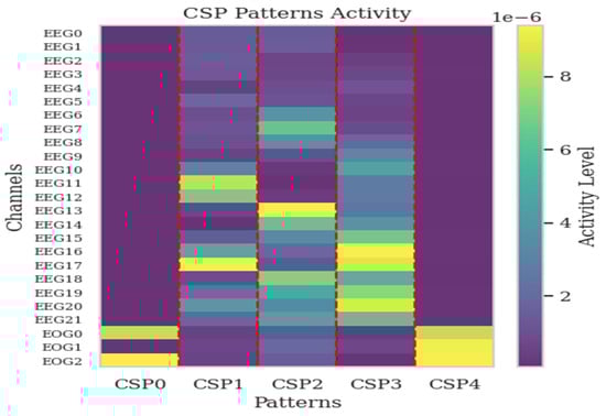 where (w−1)T is a matrix of spatial patterns in Equation (9). Before obtaining these patterns, a bandpass filter is applied between 7 and 35 Hz, as motor imagery activation typically occurs within this frequency range. The initial CSP patterns capture the highest amount of information, reflecting the contribution of each channel. These patterns are particularly crucial as they highlight the most informative channels, which play a significant role in distinguishing between different motor imagery tasks. Therefore, the first spatial patterns are examined to detect the potential inclusion of EOG channels as contributing channels. By focusing on these initial patterns, the analysis aims to determine whether EOG channels play a significant role in capturing relevant neural activity. The activations corresponding to the first five spatial patterns for each channel are plotted in Figure 7 for dataset 1 and in Figure 8 for dataset 2. For dataset 1, Channels 22, 23, and 24 (last three channels as EOG0, EOG1, EOG2) are EOG channels, while for dataset 2, Channels 60 and 61 (last two channels as VEOG, HEOG) are the EOG channels.