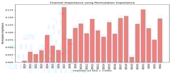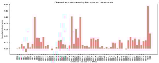 The permutation importance scores for each channel are displayed in Figure 9 for dataset 1 and in Figure 10 for dataset 2. For dataset 1, the analysis reveals that the EOG channels, particularly the last one (EOG 2), exhibit high permutation importance. EOG 0 and EOG 1 also show higher permutation importance scores compared to many of the EEG channels, indicating their significant role in the classification process.