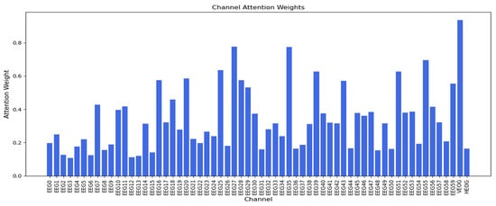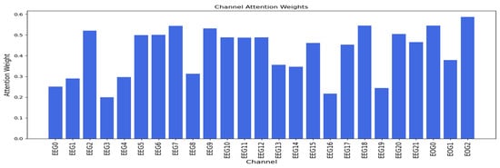 Figure 11 and Figure 12 show the attention weights for dataset 1 and dataset 2, respectively. In Figure 11, the EOG 2 and EOG 0 channels have the highest attention weights among all 25 channels, with EOG 1 also having a higher attention weight than a high number of the EEG channels. In Figure 12, the VEOG channel (channel 60) has the highest attention weight, while the HEOG channel (channel 61) has an attention weight comparable to EEG channels with lower attention weights. These findings highlight the significance of EOG channels in the channel attention mechanism for both datasets, with the exception of HEOG in dataset 2.
