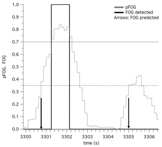Examples of accurate and inaccurate predictions of FOG events for one participant. Prediction occurs when pFOG (gray trace) monotonically rises above 0.35 (arrows). At time 3300.8 s this prediction is followed, 0.5 s later, by the algorithm’s detection of an FOG event (pFOG rises above 0.7; black trace). At time 3305, the prediction is inaccurate because it is not followed by an FOG event detection.