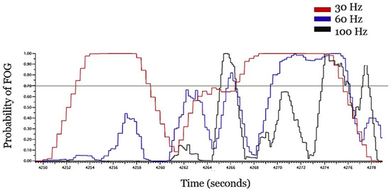 Snapshot of probability of FOG output at 100 Hz, 60 Hz, and 30 Hz. The various colored lines represent the algorithm probability value outputs for each sampling rate. The original 0.7 probability threshold to define an FOG event is marked in green.