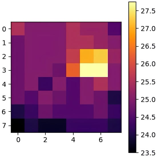 Figure 1 illustrates a typical output of the AMG8833 sensor, where the thermal data are visualized as an 8 × 8 heatmap, with lighter colors indicating higher temperatures and darker colors representing lower temperatures. These upsampled data are then processed through subsequent steps in our framework, such as adaptive thresholding and blob detection, to accurately detect and track human presence in indoor environments. The temperature scale on the right-hand side provides a reference for interpreting the values displayed in the heatmap, with a range from approximately 23.5 °C to 27.5 °C in this specific output. The variation in color shades reflects the temperature gradient across the captured area, which can correspond to various objects or individuals in the environment that emit heat.