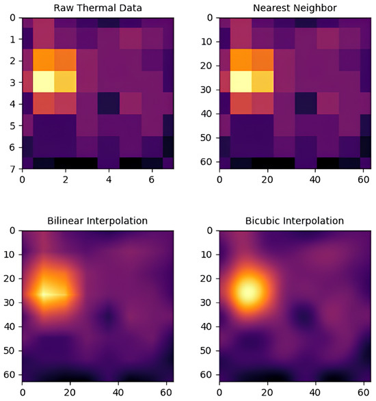 To address these challenges, our system applies interpolation to refine thermal data and enhance resolution. The raw 8 × 8 grid of thermal readings from AMG8833 is interpolated into a higher resolution matrix, resulting in smoother thermal images. This step improves spatial resolution and provides a more detailed heat distribution, enhancing downstream detection accuracy. We compared three interpolation methods: nearest-neighbor, bilinear, and bicubic interpolation. In the following, each method is discussed in detail.