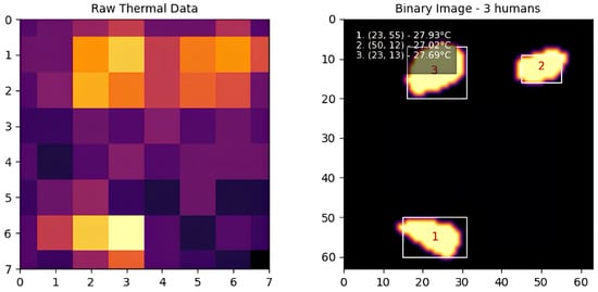 In our implementation, we use an 8-connectivity approach, meaning that a pixel is considered connected to its neighbors if they share a side or corner. This ensures that even diagonally connected regions are treated as part of the same entity, which improves the robustness of human detection in cases where individuals may be partially overlapping. The output of CCL is a set of labeled regions, each assigned a unique identifier, which are then used for further processing and analysis. Figure 4 shows the process of applying connected component labeling to the thermal map, starting from raw thermal data, followed by interpolation, adaptive thresholding, and finally, identifying distinct human regions using CCL. The labeled regions are displayed in the binary image, where each identified individual is enclosed within a bounding box and assigned a unique identifier.