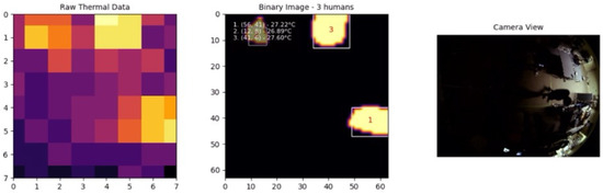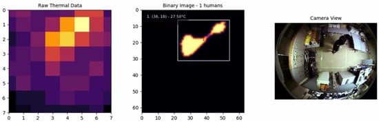 The AMG8833 infrared thermal sensor [7] is an example of such a technology. This sensor is an 8 × 8 infrared thermal array capable of detecting temperature changes with a resolution sufficient to monitor human presence and movement. However, the relatively low resolution of the sensor presents challenges in accurately distinguishing between multiple individuals and precisely determining their positions dynamically.