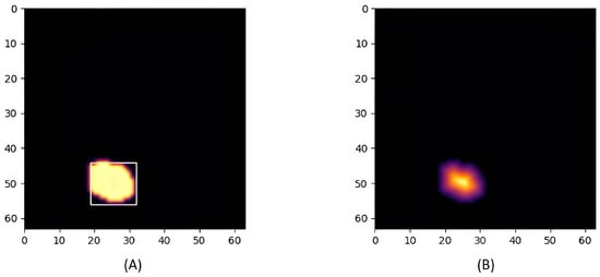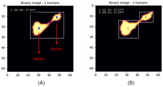 Figure 7 illustrates the application of the watershed algorithm to separate thermal signatures with closely positioned positions. In Image (A), because the distance between the markers is less than the defined threshold, the watershed algorithm is applied. Image (B) shows the resulting segmented thermal image after applying this algorithm, effectively isolating the thermal signatures of each individual.