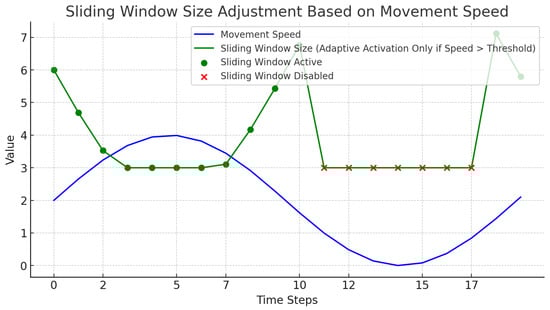 The sliding window is initialized with both a minimum and maximum window size. The minimum window size allows for responsiveness to rapid movement, while the maximum size ensures greater temporal smoothing during slower movements. The system uses a speed threshold to determine when the adaptive adjustment should be activated. Only when the detected speed exceeds the threshold is the adaptive sliding window activated, allowing for window size adjustments and smoothing of position estimates. When the movement speed is below the threshold, the adaptive sliding window is disabled, and the system returns directly to the current position without applying any smoothing. Figure 8 visually demonstrates how the window size dynamically changes over time as speed varies, emphasizing the conditional activation of the adaptive mechanism.