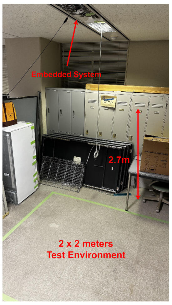 The experimental setup for this research involved using a Raspberry Pi 4 Model B with 8 GB RAM as the main processing unit. The Raspberry Pi 4 was selected for its edge computing capabilities, which allow data processing at the source, mitigating potential issues related to network latency. The Raspberry Pi 4 was mounted on the ceiling at an approximate height of 2.7 m from the ground. The AMG8833 infrared thermal sensor was connected to the Raspberry Pi, serving as the primary device for detecting human presence. Experimental measurements indicated that, when placed at a height of 2.7 m, the AMG8833 sensor effectively covered a detection area of approximately 2 × 2 m on the ground, forming a square coverage zone, as shown in Figure 9. Adjacent to the thermal sensor, a camera module was installed, which also interfaced with the Raspberry Pi. The purpose of the camera was solely to validate the thermal sensor’s performance in terms of detecting human presence and accurately determining positioning. The complete system configuration is shown in Figure 10, and the pin diagram is shown in Figure 11.