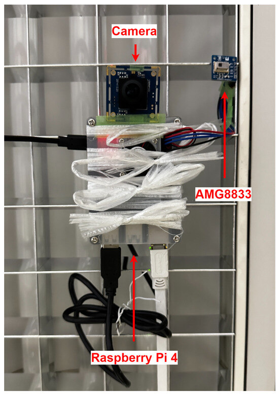 The AMG8833 communicates with the data processing system through an I2C (Inter-Integrated Circuit) interface, using a slave address of 0 × 69 for data transmission. The communication protocol allows the sensor to be easily integrated with systems such as Raspberry Pi4 for real-time data acquisition. During data collection, the sensor continuously captures the thermal heat distribution in the surrounding environment, transmitting the temperature values from each of the 64 pixels over the I2C bus at regular intervals. The key technical specifications of the AMG8833 sensor, including its pixel resolution, detection range, and temperature detection range, are summarized in Table 2.
