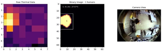 Figure 12 illustrates the result when an individual was moving within the environment. The system was able to accurately detect and track the individual, demonstrating the reliability of the adaptive thresholding technique in maintaining consistent detection. In particular, the individual temperature detected was approximately 27.57 °C, which is significantly lower than the expected human body surface temperature of 36 °C to 37 °C. The discrepancy is due to the AMG8833 sensor’s installation height and wide field of view, which cause averaging of human thermal signatures with the cooler surroundings and attenuation of infrared radiation. These limitations result in a detected temperature that is lower than the actual temperature of the body surface.