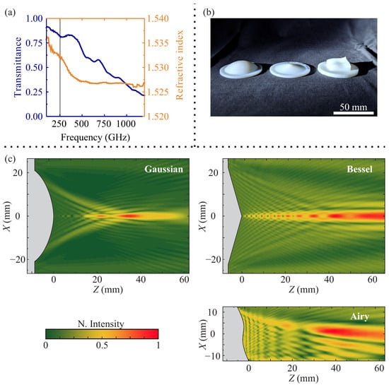 (a) Spectral dependencies of transmittance and refractive index of the employed high-impact polystyrene (HIPS). The gray vertical line depicts the position of the 253 GHz, corresponding to the frequency of the resonant source, employed within the presented research. (b) Photo of the 3D-printed lenses employed within the presented research; here, the diameter of each component is equal to 50.8 mm. (c) Simulation, revealing electric field distribution along the optical axis ( plane) for the fabricated structures. Simulations were conducted using the finite difference time domain (FDTD) method. Note the appearance of the focused point for the case of the Gaussian lens, the longitudinal focused beam for the case of the Bessel lens, and the curved longitudinal focused beam for the case of the Airy lens.
