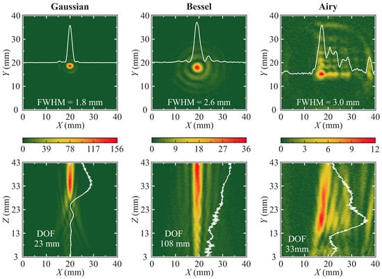 Sketch depicting the beam-shaping abilities of different fabricated structures, revealed via 2D scanning of focal plane (, upper row) and along the optical axis (, bottom row). Note the smallest FWHM of the Gaussian beam and the largest depth of focus for the Bessel beam. White lines represent intensity profile through the center of the focal plane (top row) and along the optical axis (bottom row).